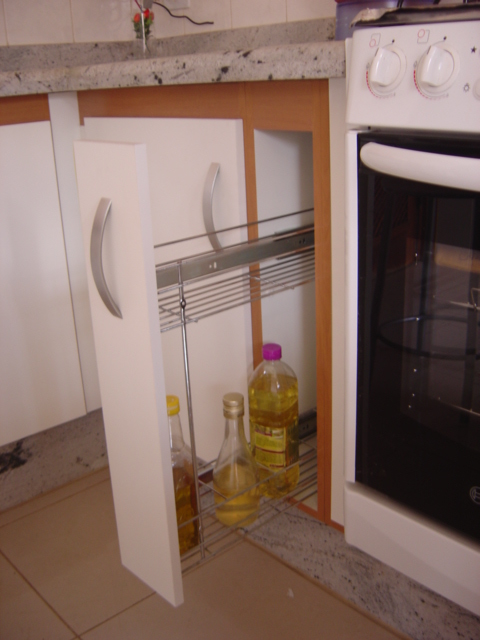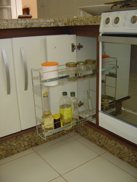 Neste modelo, o porta tempero fica instalado dentro do armário, funcionando de forma independente da porta.