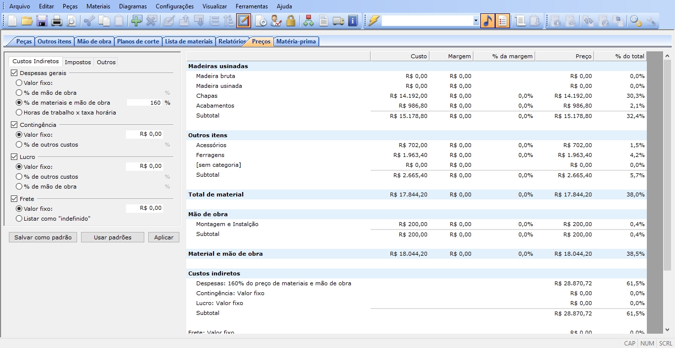 • Lista de materiais, insumos e resumo de custos automáticos;