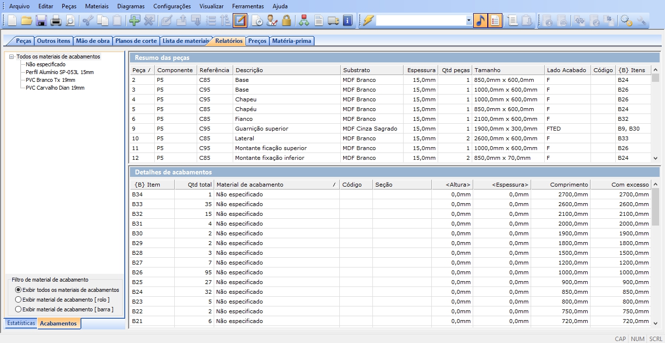 • Calculo de cortes e acabamentos de borda necessários para suas peças;